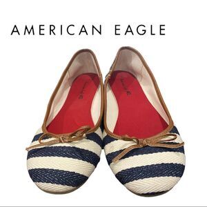 American Eagle women's blue and cream, striped, slip-on ballet flats with a bow on the toes.
