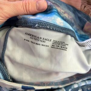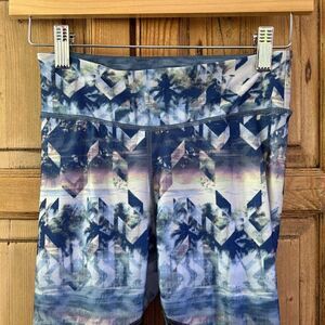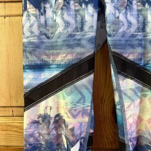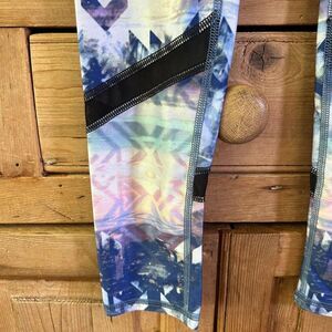 Features: Very cute pair of patterned athletic leggings. Mesh strips on the thighs and under the knees. Cropped length. Almost a watercolor like appearance.
