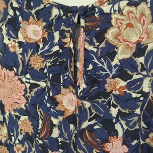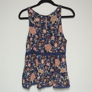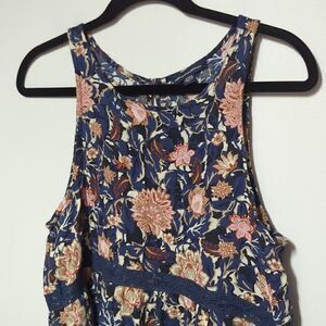 Blue floral sleeveless blouse. White, pink, rust, tan floral. Blue lace on trim and panel in midsection. Button closure on the back.