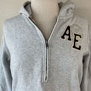 Classic gray hoodie featuring a slightly cropped fit and American Eagle (AE). It’s in excellent preowned condition and measures 20 inches armpit to armpit laying flat and 21 inches in length from shoulder to hem.