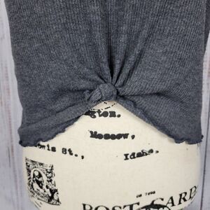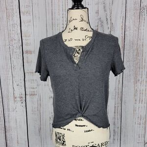 Item: American Eagle Grey Ribbed Small Ruffle Button Casual Short Sleeve Tee Shirt. Front is tied in photo but can be taken out.
