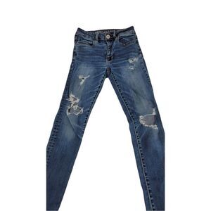 American Eagle Hi-Rise Jeggings. Dark Wash Skinny Jeans. Destroyed (distressed). Has Stretch. Womens size 0