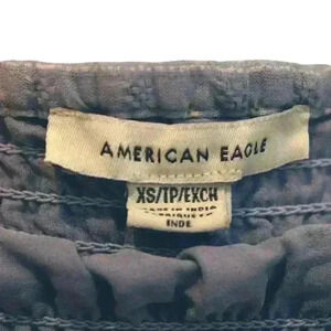 The American Eagle Light Blue Floral Blouse is a cute and trendy addition to any wardrobe. With a ruched bodice and long sleeves, this size XS blouse offers a comfortable and flattering fit. The elastic neckline and tie front add a touch of femininity, while the ruffles around the wrist create a playful and stylish look. The light blue floral pattern is perfect for the spring and summer seasons. With a cropped style, the blouse has a breast measurement of 24 inches and a length of 11 inches, making it a versatile choice for any outfit. Whether paired with high-waisted jeans or a skirt, this blouse is sure to turn heads. Perfect for any casual occasion, this American Eagle blouse is a must-have for any fashion-forward wardrobe.