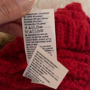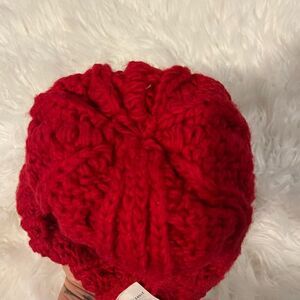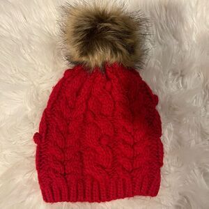 Super adorable red cable knit hat with faux fur pom pom on top, OS. Worn a few times. Great condition ✨