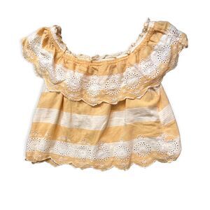 American Eagle Yellow and white Striped Off the Shoulder Cropped Blouse. Elastic around neckline, can wear off shoulder, flounce at top. Embroidered and eyelets.