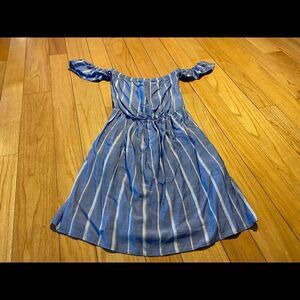 American Eagle off the shoulder blue/white vertical stripe dress. Cinched waist. Length 26 inches. 100% viscose. Size XS. Great condition.
