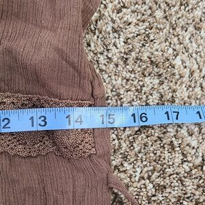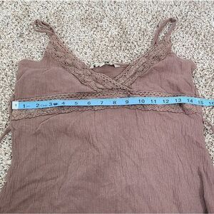 American Flirt Shirt, camisole style top. Size medium, fits true to size as does not fit on my plus size mannequin. EUC, like new. Maybe worn a couple of times. V neck/v neckline, wrap, crisscross style. Knitting/crochet trim on the top and bust. Brown ribbon on the bust as well. Very feminine and cute! Measurements: bust: about 15 inches, length: about 19 & a half inches.