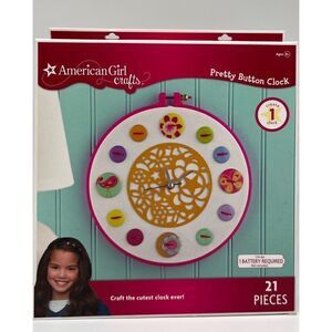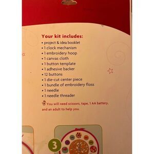 • • Kit includes a clock mechanism, embroidery hoop, canvas cloth, button template, adhesive chipboard backer, die-cut chipboard center piece, 12 buttons, embroiderv floss. needle. needle threader