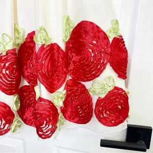 Beautiful sleeveless off white cream dress with red circle rosette floral pattern and button and tie back closure.