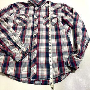 American Rag Mens Plaid Button Down - Size (M) Red/White/Blue Plaid with white buttons and front pockets. Good condition other than small spot on lower front, see photos.