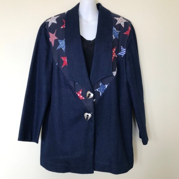 Handmade western style denim blazer coat has patterned star print shoulders front yoke with denim lapels. Metal heart shaped concho embellishments on the front with snap closure. Very nice handmade condition.