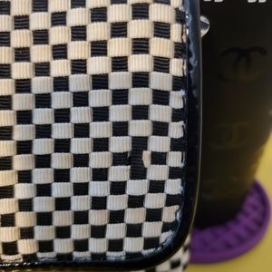 Outside - basketweave black and cream clutch, 2 button closure, back opening space