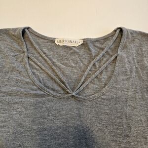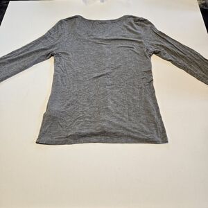 Stylish heather gray women's scoop neck 3/4 sleeve top perfect for any occasion on its own, or as a layering piece. The straps in the scoop neck give it a unique look. Comfortable and versatile, an ideal neutral basic for every closet.