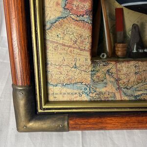 Beautiful nautical themed shadowbox artwork. Contains sailboat and tools for sailing, plus a photo of Americo Vespucci’s boat. Measures 18”x17”x3”