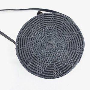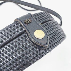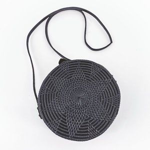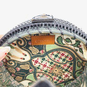 Black hand-woven rattan crossbody bag. Star/flower pattern. Snap button closure at the top. Pretty green tone floral lining.