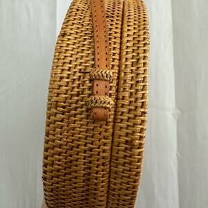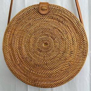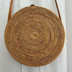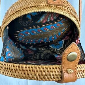 Amerii Rattan Circle Crossbody Purse. black and blue pattern on the inside. in good preowned condition!