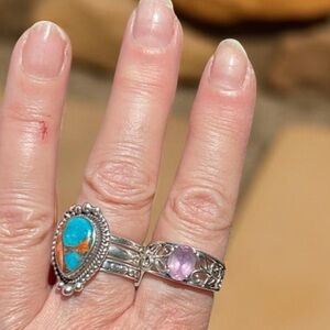This is a size 7 sterling silver ring with open work. The amethyst is round brilliant cut and has a beautiful sparkle. I love it! The ring is new and comes in the box shown. The amethysts legend is that it will protect the owner. The amethyst is the birthstone of February. This ring has a substantial weight to it and is natural gemstone and genuine sterling silver. This ring would make a perfectValentine’s Day gift. 🎁 please shop with confidence I ship within one business day sometimes the same day I stand behind all my products.