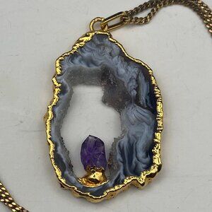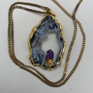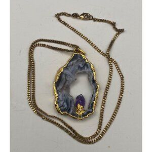 Amethyst Agate Geode Drusy Pendant Necklace Nickel Free Gold Tone 24" Chain