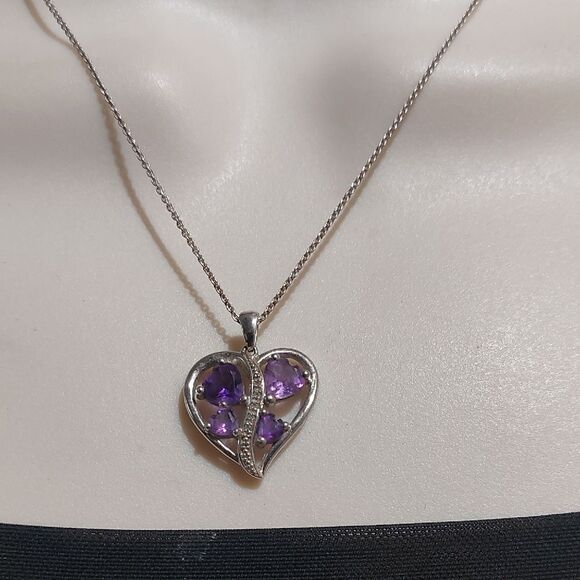 open heart pendant with 4 heart shaped Amethyst stoned and diamond paved across middle bar of the heart pendant.