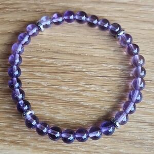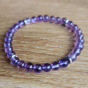 Handmade Stretch Stone Bracelet – Strong & Durable! Genuine Semi-Precious Gemstone Crystals 6 mm Amethyst Also Stainless Steel Accents This bracelet is handcrafted by me and one of a kind – you’ll receive the exact item shown! Approximately 7.25 inches Please check the SIZING LISTING in my closet for help with fit. Need a different size? I can usually resize – just send me a message! Each stone is unique. My crystals and beads are natural, so expect small variations in color, shape, or texture. That’s what makes them special! Metaphysical vibes: Many people wear healing crystals to help reduce stress, boost energy, or block negative vibes. (Just a friendly note: crystals are for spiritual support and are not a medical treatment.) Bracelet Care: • Roll over your hand – don’t stretch or pull • Avoid wearing in water • Remove before bed • Store with care to help it last I do my best to show accurate colors, but lighting can affect how beads look on screen. I offer discounted shipping on bundles of 2 or more items