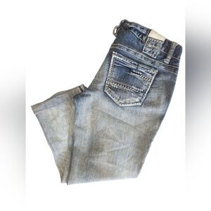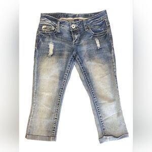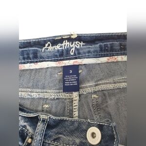 Amethyst blue capri jeans with stylish stitching. Features a button closure and belt loops.