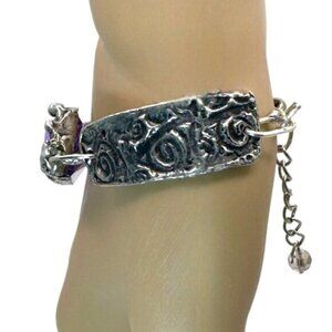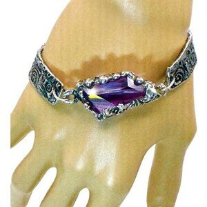Crafted with love, this boho bracelet showcases intricate silver metalwork and a striking purple crystal centerpiece. Each link is meticulously handmade, embodying unique artistry and timeless elegance.