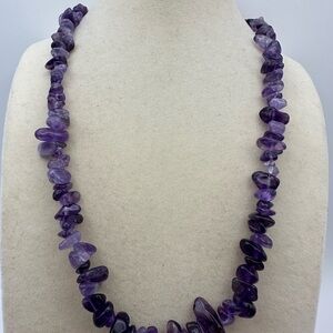 Amethyst chips beaded necklace with gold tone hardware and lobster clasp. Necklace is about 15” long with 1.5” extender chain. Stones are a beautiful purple color.