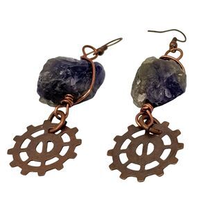 Elevate your jewelry collection with these unique artisan-crafted dangle earrings. Featuring natural purple amethyst stones wrapped in copper wire, these earrings are adorned with steampunk-inspired gear charms, perfect for adding a bold statement to your look.