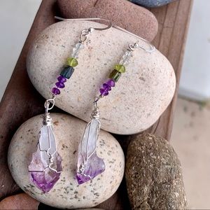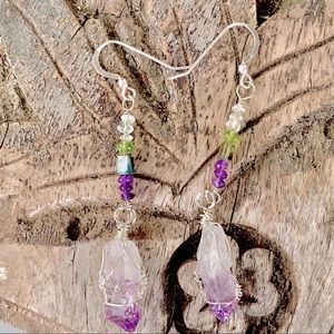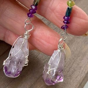 Feel good arty dangles of violet crystals and green stone beads. Brazil Amethysts hand wrapped by me in Sterling, swing from a column of Clear Topaz, Peridot, Tourmaline & more Amethysts. I feel these are a spiritual ally offering protection, purification, wisdom & a wonderful sense of calm! On Sterling earwires, gift boxed with signature artwork and crystal notes, Artisan, one of a kind.