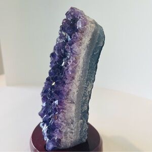 Beautiful amethyst crystal geode with deep purple hues. Mounted on a wooden stand. Crystal face 2” x 5.5”. See pics.