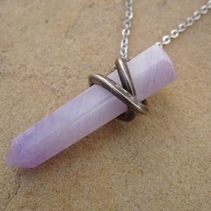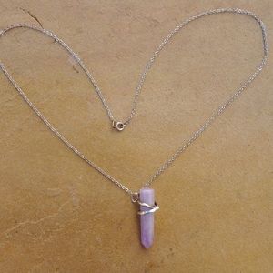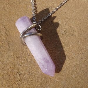 This boho chic necklace features a genuine Amethyst crystal point wrapped in a silver swirl.
