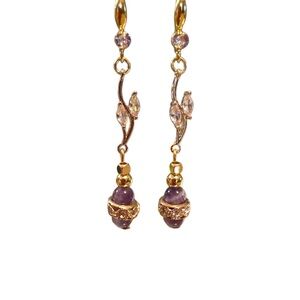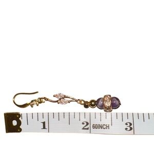 Hand Designed These elegant earrings feature a stunning combination of goldtone & cubic zirconia leave design w/ amethyst, goldtone & cubic zirconia spacer beads . 18K gold plated hypoallergenic fish hook earrings with cubic zirconia stone. Gold tone beads @ spacers .Comes with rubber backs. Perfect for adding a touch of sophistication to any outfit.