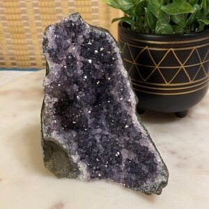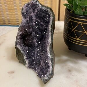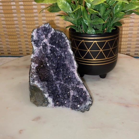Enhance your space with this stunning amethyst geode crystal. Its deep purple hue adds a touch of elegance and tranquility to any room.