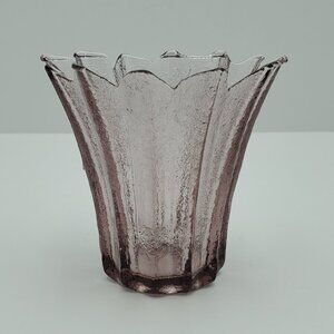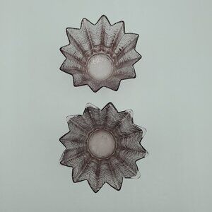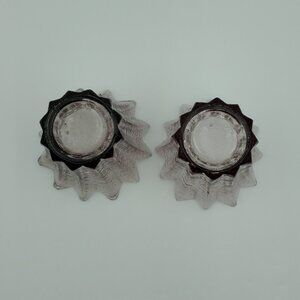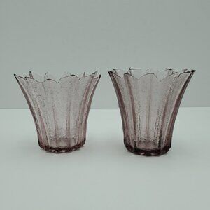 Amethyst Frosted Purple Glass Votive Candle Holders - Set of 2. These jagged edge candle dishes, small vases, decor pieces are in excellent pre-owned condition. Approximately 4" tall (one is slightly taller than the other), 4" wide, 2" at the base.
