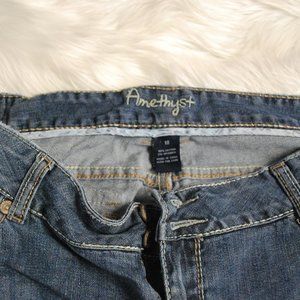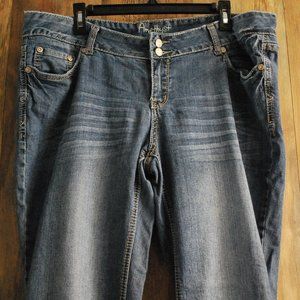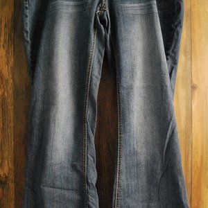 Stylish boot cut jeans. Classic blue denim. Unique pocket stitching.They have been hemmed to 32” length