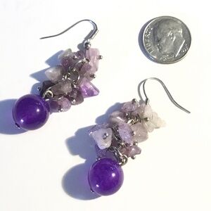 These 2” long drop earrings are composed of amethyst nuggets individually attached to chain and and a swinging end drop of an 11mm stone dyed a deep purple. I believe the metal is a plated stainless steel. Excellent vintage condition.