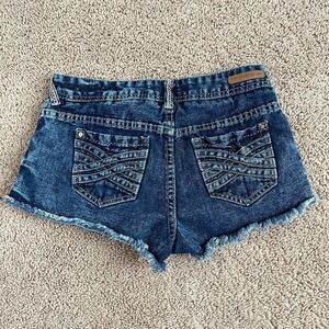 Amethyst Penny Mid Rise Button Fly Dark Wash Fray Hem Cotton Jean Shorts 3