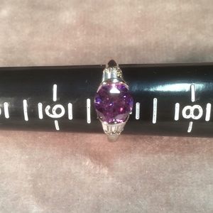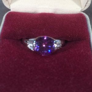 Amethyst rhinestone ring with clear rhinestone baguettes on the side. Set in a silver tone metal.