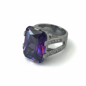 A large emerald cut purple rhinestone is the centerpiece of this amazing cocktail ring