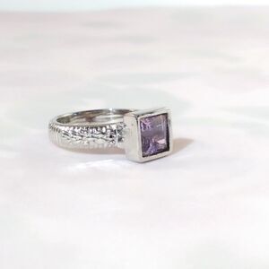- The amethyst gemstone is set on a hypoallergenic stainless steel ring.