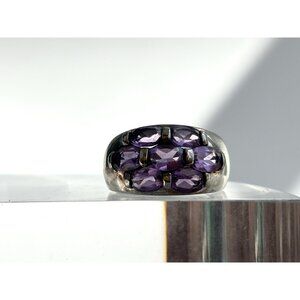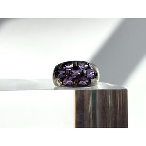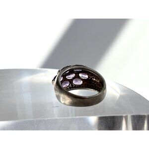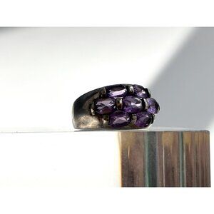 Lovely sterling silver vintage amethyst adorned ring. The stones are all oval cut and half bezel set. Tapered shank. Marked as sterling and tested positive as such via chemical testing.
