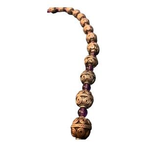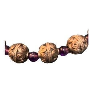Clear round amethyst 1/4” beads with 1/2” patterned wispy beads from Nepal make this a truly unique gemstone necklace! Burnished silver beads give itan ethnic flavor.