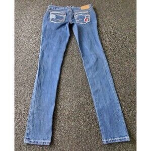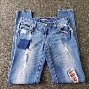 Nice pair of distressed jeans with plaid peek-a-boo patches in very good condition.