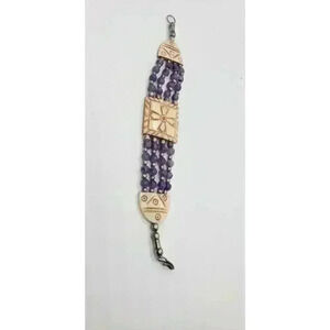 Beautiful bracelet with a primitive design that is multi strands of genuine amethyst beads in Sterling silver accent beads. 3 pieces of a resin type material featuring floral detail. Hook closure.