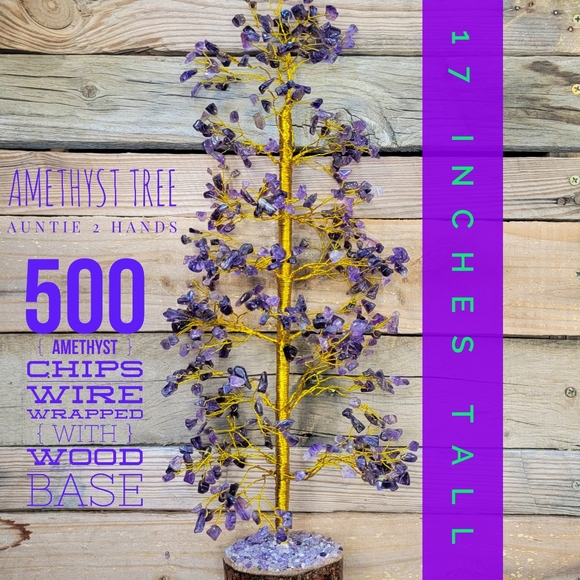 Stands 17 inches tall, wood base, gold wire has individually wrapped 500 amethyst chips. Gorgeous colors and perfect for any entry, bedroom, or Zen Den.