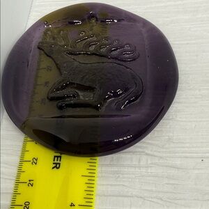 Beautiful purple glass paperweight suncatcher or pendant drilled featuring a deer. Perfect for adding a touch of elegance to any desk or shelf or self and it may be an unsigned Benko in research. Sold unknown designer as photographed. So pretty!