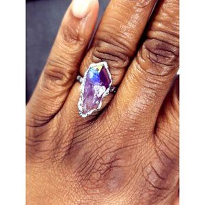 This one of a kind ring was crafted from a little free formed raw rainbow aura amethyst crystal gemstone that gives off some nice facets and inclusions depending on the lighting and angle.