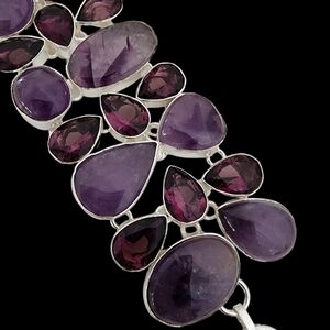 Silver gemstone bracelet - statement bracelet chunky bracelet. Genuine amethyst gemstones. Sterling silver overlay. Adjustable length: 6.25 inches to 7.75 inches. Toggle clasp. Chunky statement bracelet - 1.5 inch wide. Sterling silver overlay. Stamped 925. Handcrafted bracelet. Artisan made jewelry. New. All photos 📷 were taken by me and are of the actual item. Q05