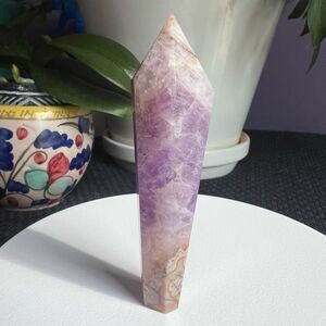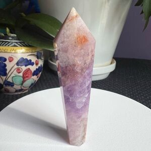 An amethyst with a crazy lace wand combines the calming, spiritual enhancement of amethyst with the vibrant, protective energies of crazy lace agate. Intricate unique patterns throughout. This wand aids in stress relief, enhances mental clarity, and promotes balance, joy, and protection, making it ideal for meditation and healing rituals.