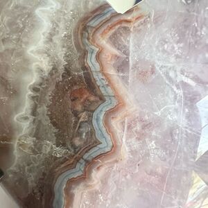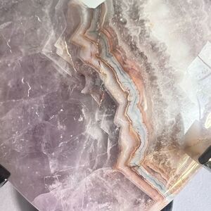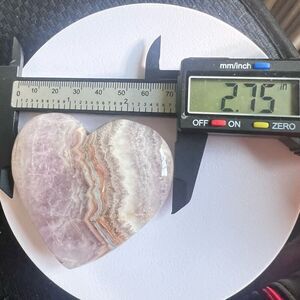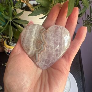 This enchanting amethyst and crazy lace agate heart across the mid section , set on a sleek gunmetal display stand, combines the calming energy of amethyst with the joyful vibrations of crazy lace agate. Amethyst promotes tranquility and spiritual growth, while crazy lace agate enhances joy and mental agility, making it a powerful centerpiece for both decor and well-being.